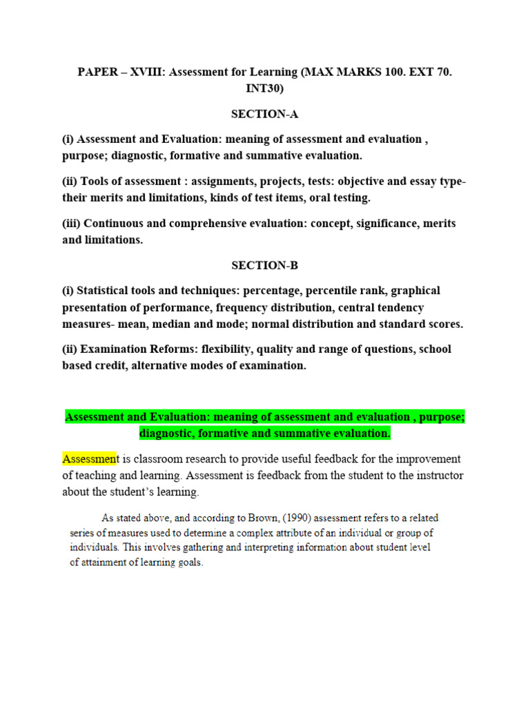 PAPER – XVIII: Assessment for Learning (MAX MARKS 100. EXT 70.