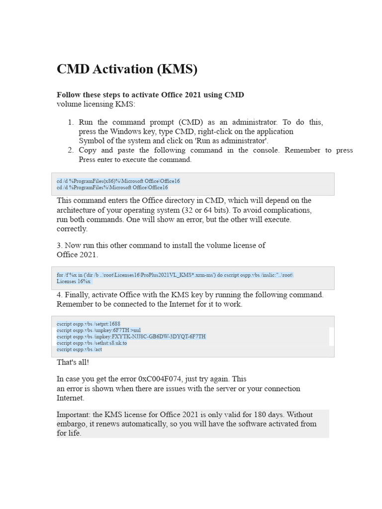 Important: the KMS license for Office 2021 is only valid for 180 days. Without