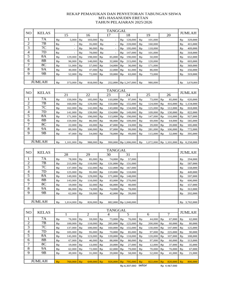 REKAP PEMASUKAN DAN PENYETORAN TABUNGAN SISWA