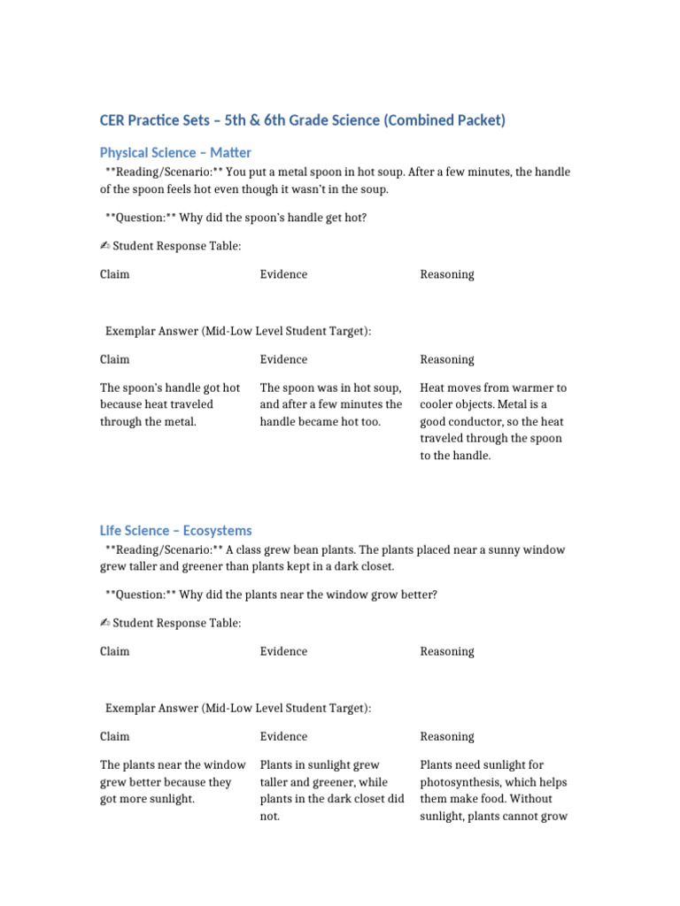 CER Practice Sets – 5th & 6th Grade Science (Combined Packet)
