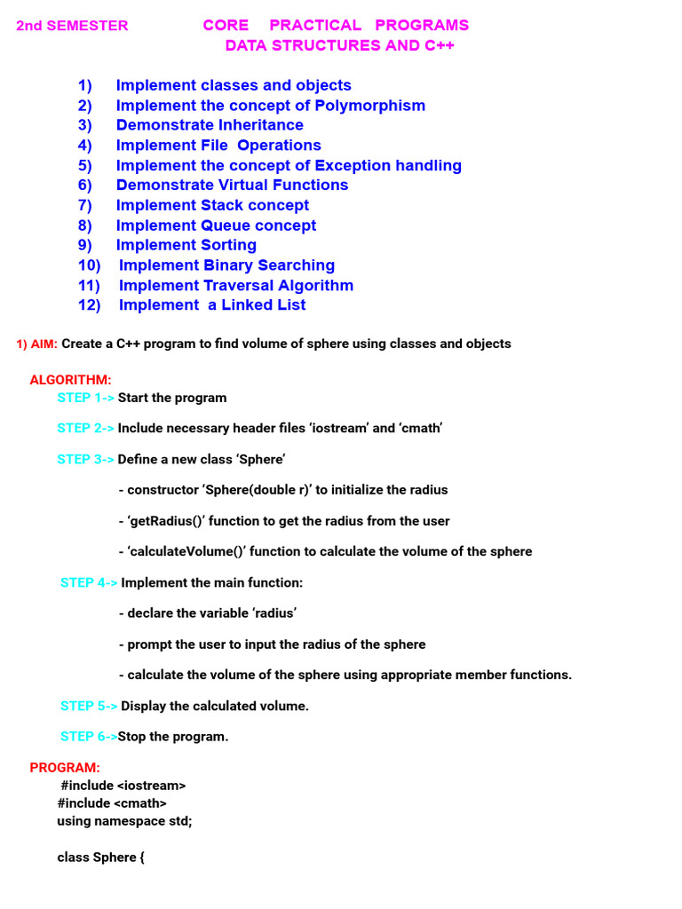 1) AIM: Create a C++ program to find volume of sphere using classes and objects