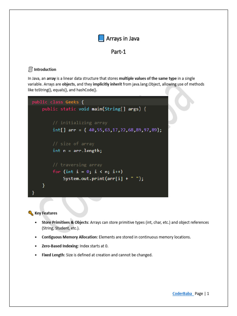 • Note: Arrays in Java are not dynamically resizable — size must be fixed at creation. For resizable