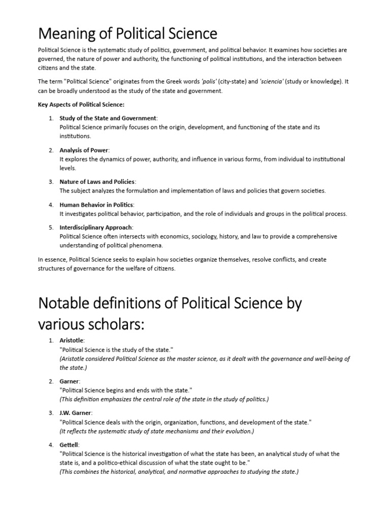 These defini ons collec vely capture the essence of Poli cal Science, emphasizing its focus on the state, governance,