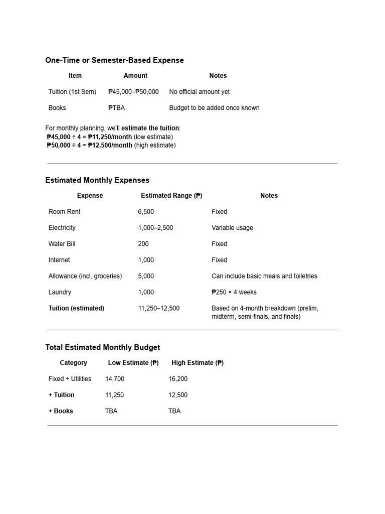 Tuition (1st Sem) ₱45,000–₱50,000 No official amount yet
