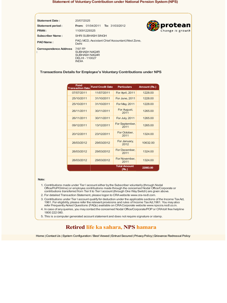 Statement of Voluntary Contribution under National Pension System (NPS)