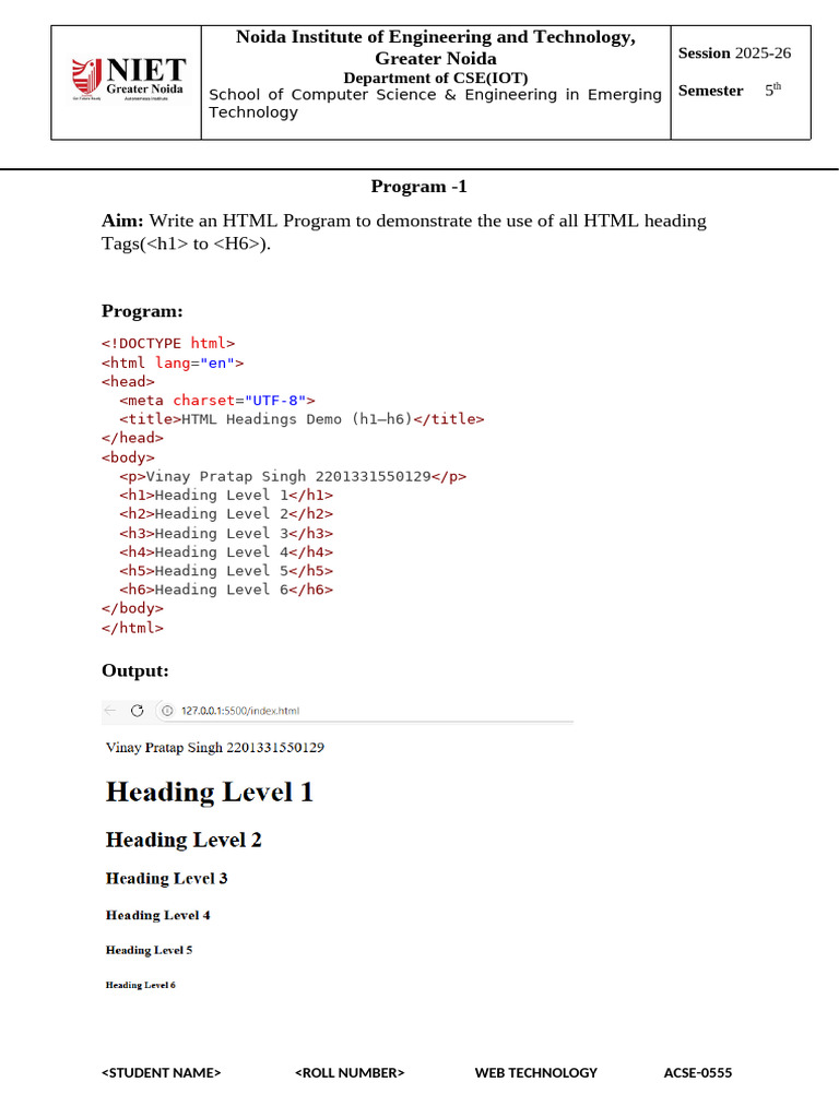 3. Aim: Write an HTML program to demonstrate the use of all HTML Heading Tags (<h1>