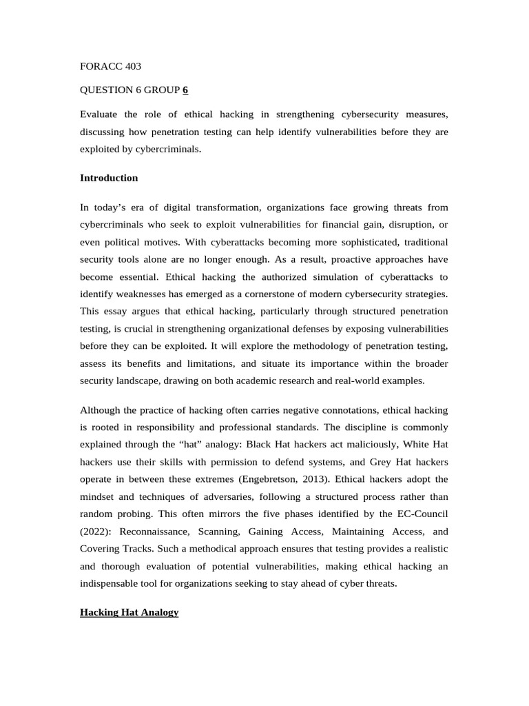 This essay argues that ethical hacking, particularly through structured penetration