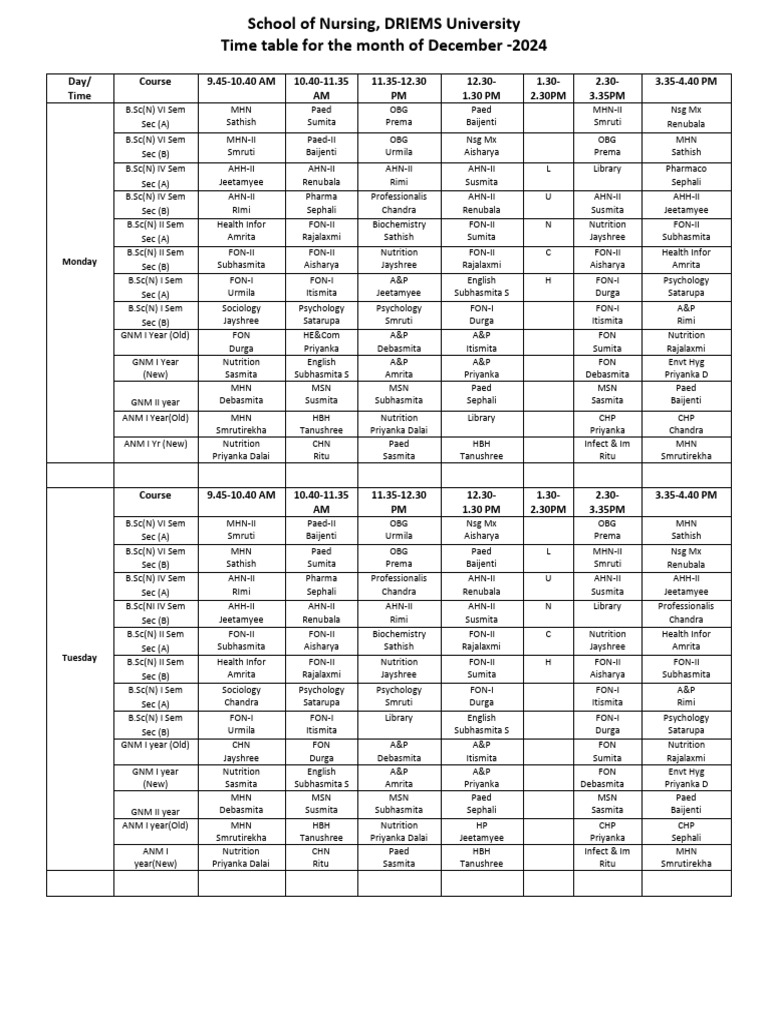 Time table for the month of December -2024