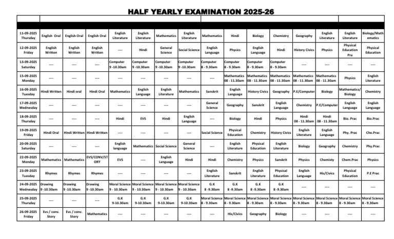 Hindi Written Hindi oral Hindi Oral Mathematics Mathematics Sanskrit History Civics Geography P.E/Computer Biology Chemistry