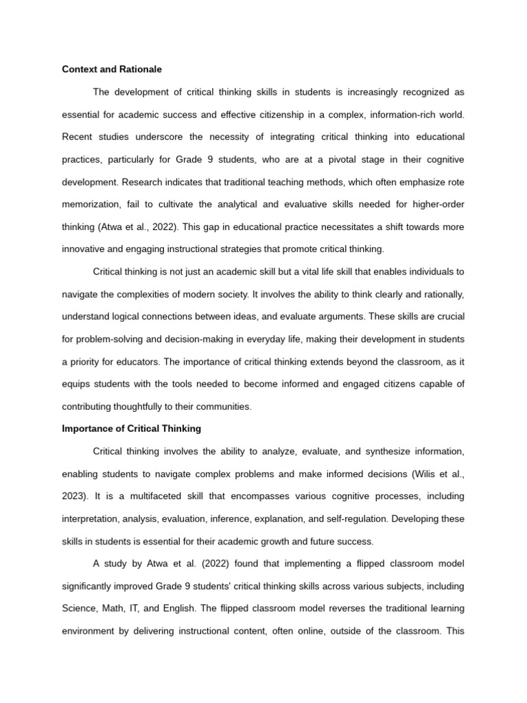 This action research is grounded in the need to enhance Grade 9 students' critical