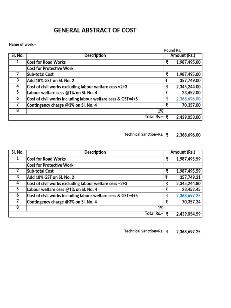 C. COST OF CIVIL WORK EXCLUDING LABOUR WELFARE CESS = Rs.= ###