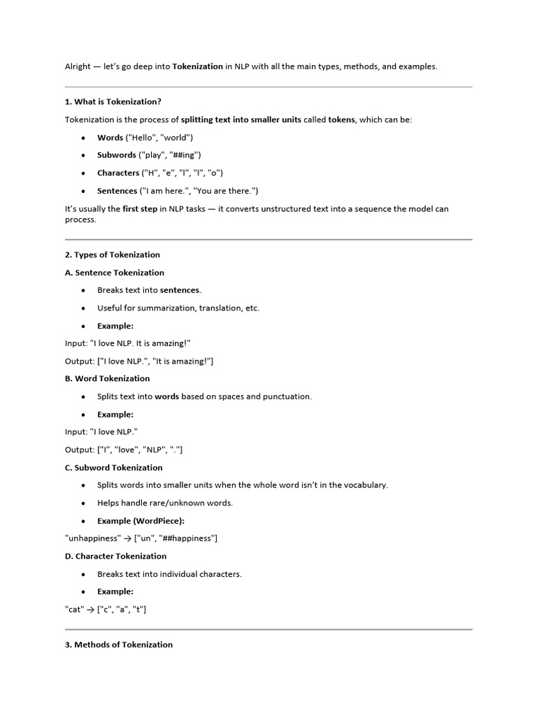 Alright — let’s go deep into Tokenization in NLP with all the main types, methods, and examples.
