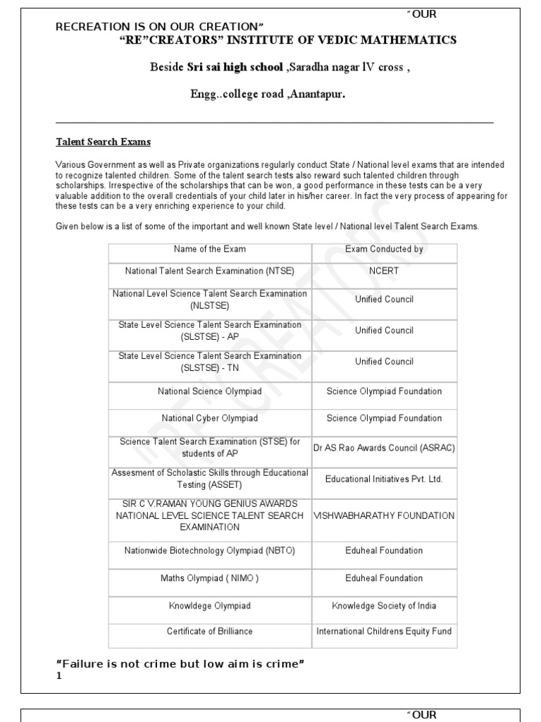 Various Government as well as Private organizations regularly conduct State / National level exams that are intended to recognize talented children. Some of the talent search tests also reward such talented children through scholarships. Irrespective of the scholarships that can be won, a good performance in these tests can be a very valuable addition to the overall credentials of your child later in his/her career. In fact the very process of appearing for these tests can be a very enriching experience to your child. Given below is a list of some of the important and well known State level / National level Talent Search Exams. Name of the Exam National Talent Search Examination (NTSE) National Level Science Talent Search Examination (NLSTSE) State Level Science Talent Search Examination (SLSTSE) - AP State Level Science Talent Search Examination (SLSTSE) - TN National Science Olympiad National Cyber Olympiad Science Talent Search Examination (STSE) for students of AP Assesment of Scholastic Skills through Educational Testing (ASSET) SIR C V.RAMAN YOUNG GENIUS AWARDS NATIONAL LEVEL SCIENCE TALENT SEARCH EXAMINATION Nationwide Biotechnology Olympiad (NBTO) Maths Olympiad ( NIMO ) Knowldege Olympiad Certificate of Brilliance Exam Conducted by NCERT Unified Council Unified Council Unified Council Science Olympiad Foundation Science Olympiad Foundation Dr AS Rao Awards Council (ASRAC) Educational Initiatives Pvt. Ltd.