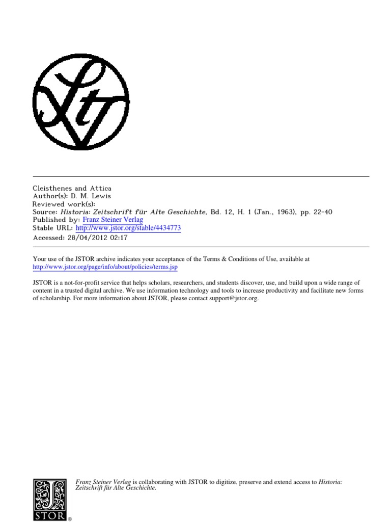 CLEISTHENES AND ATTICA. There has been much recent work on Cleisthenes.' The justification for yet another article lies, I hope, in its different approach, from the land of Attica itself and the framework which Cleisthenes gave it. I hope also that this difference of approach will excuse what may seem a somewhat cavalier attitude to my immediate predecessors, whose arguments will seldom appear, although I have read them with attention and profit. The argument of this article proceeds largely from survivals, and leads to the paradox that we can understand Cleisthenes' work best in the places where he failed. These failures, however, give us clearer light not only on his aims, but on the woven texture of tradition and innovation which is formed by the life of classical Athens. I. Regional Parties in Sixth-Century Athens.