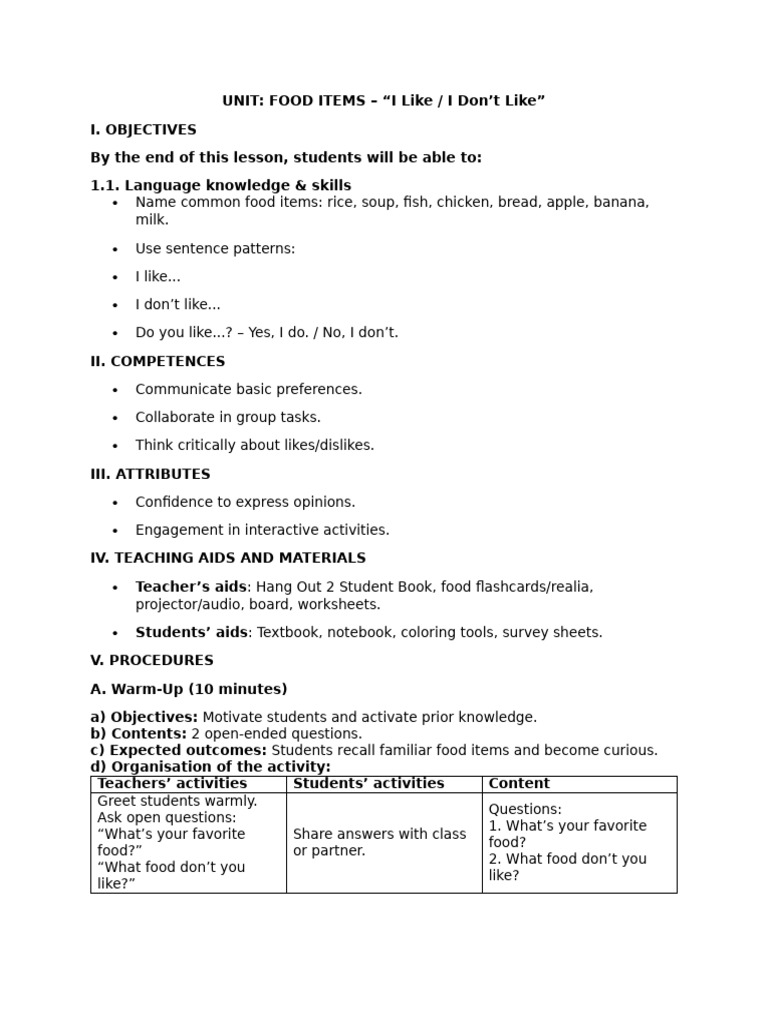 UNIT: FOOD ITEMS – “I Like / I Don’t Like”