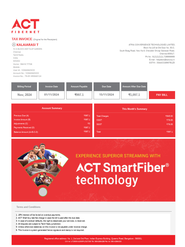 Nov, 2024 01/11/2024 ₹997.1 15/11/2024 ₹1,097.1 PAY BILL