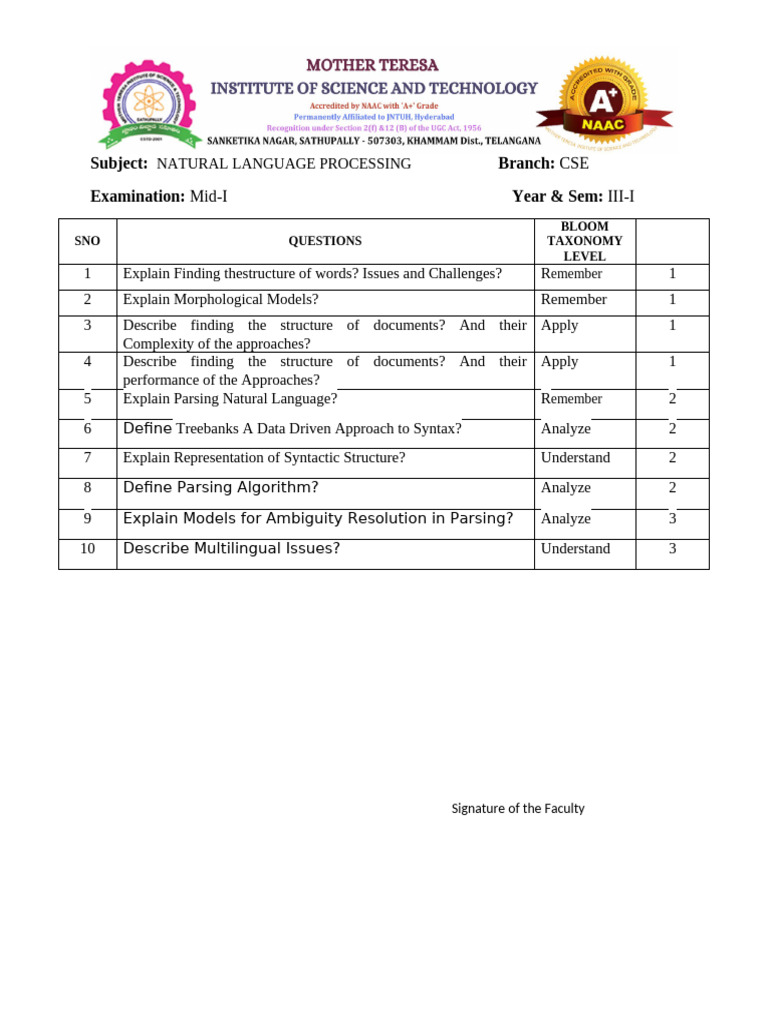 Subject: NATURAL LANGUAGE PROCESSING Branch: CSE