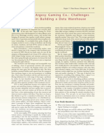 CASE 2 Argosy Gaming Co.: Challenges in Building a Data Warehouse When youve got half a dozen riverboat gambling operations, its important that everyone plays by the same rules. Argosy Gaming Co. (www.argosycasinos.com), with headquarters in Alton, Illinois, and a fleet of six Mississippi riverboat casinos, had decided that bringing all customer data together would enhance managements view of operations and potentially help strengthen customer relationships. To accomplish those goals, though, the company needed to access a variety of databases and develop an extract, transform, and load (ETL) system to help construct and maintain a central data warehouse. Jason Fortenberry, a data-warehousing analyst, came aboard at Argosy just as the companys data warehouse project started in 2001. His job was made easier, he says, by the adoption of Hummingbird Ltd.s Genio ETL software tool, which helped bridge systems and automate processes. But like others going through such projects, he learned the hard way that preparing for the ETL process is just as important as having the right software. The riverboats each had unique and incompatible ways of defining a host of operational activities and customer characteristicsin essence, the floating casinos were each playing the same game but with different rules. But those problems remained hidden until reports from the companys data warehouse began to turn up inconsistent or troubling data. Thats when Fortenberry and his staff discovered conflicting definitions for a wide range of data typesproblems he wished he had identified much earlier. Fortenberrys troublesand his successesare typical of ETL, the complex and often expensive prelude to data warehouse success. ETL is often problematic because of its inherent complexity and underlying business challenges, such as making sure you plan adequately and have quality data to process. Analysts, users, and even vendors say all bets are off if you dont have a clear understanding of your data resources and what you want to achieve with them. Then there are choices, like whether to go for a centralized architecturethe simplest and most common configuration or a distributed system, with ETL processing spread across various software tools, system utilities, and target databases, which is sometimes a necessity in larger, more complicated data warehouses. Even if you navigate those waters successfully, you still need to ensure that the ETL foundation you build for your data warehouse can meet growing data streams and future information demands. As the term implies, ETL involves extracting data from various sources, transforming it (usually the trickiest part), and loading it into the data warehouse. A transformation could be as simple as reordering the fields of a record from a source system. But as Philip Russom, a Giga Information Group analyst, explains, a data warehouse often contains data values and data structures that never existed in a source system. Since many analytical questions a business user would ask of a data warehouse can be answered only with calculated values (like averages, rankings or metrics), the ETL tool must calculate these from various data sources and load them into the warehouse. Similarly, notes Russom, a data warehouse typically contains time-series data. The average operational application keeps track of current state of a value such as a bank account balance. Its the job of the ETL tool to regularly add new states of a value to the series. For his year-long ETL project, Argosys Fortenberry says Hummingbirds Genio Suite, a data integration and ETL tool, quickly became the projects central nervous system, coordinating the process for extracting source data and loading the warehouse. But for Argosy, getting all that data into the warehouse didnt produce immediate usable and dependable results. The lesson was that people thought that they were talking about the same thing, but they actually were not, says Fortenberry. For example, riverboats calculated visits differently. One riverboat casinos would credit a customer with a visit only if he actually played at a slot machine or table. Another had an expanded definition and credited customers with visits when they redeemed 3