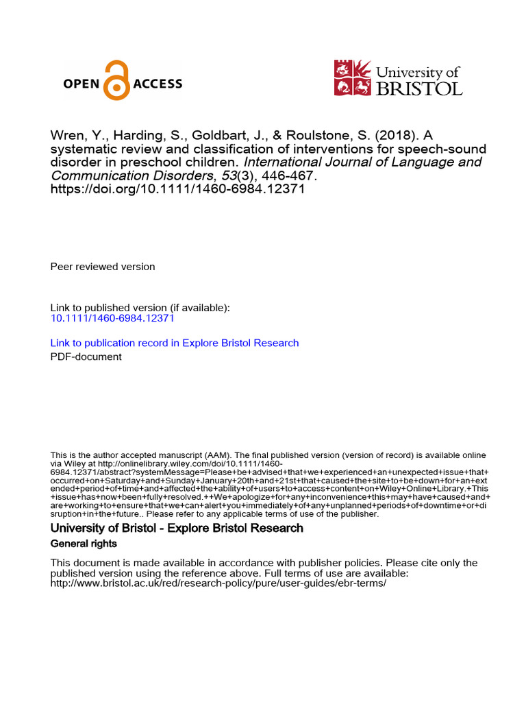 Title: A systematic review and classification of interventions for speech sound disorder in