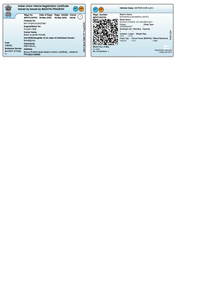 Indian Union Vehicle Registration Certificate