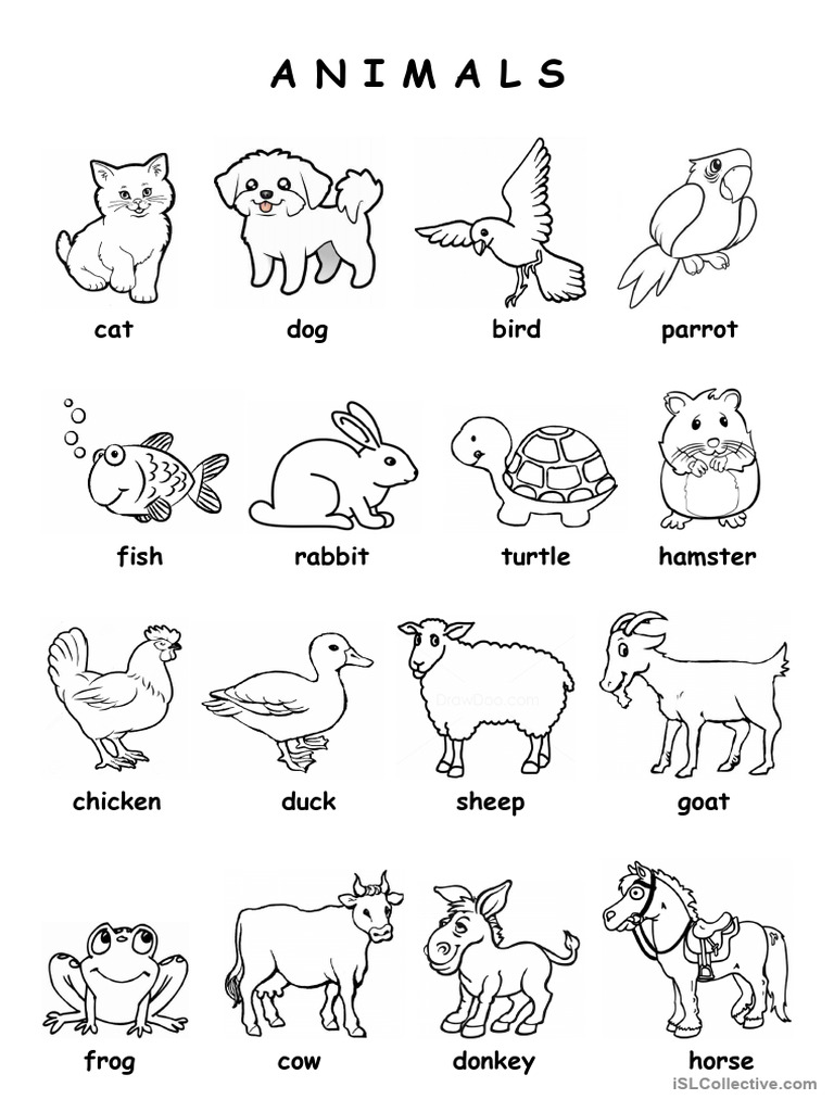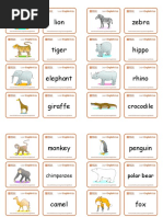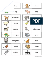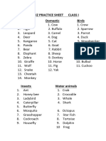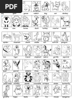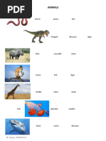 The document lists various animals categorized into different groups such as pets, farm animals, and wild animals. It includes a wide range of species including mammals, birds, reptiles, and aquatic animals. The layout appears to be visually organized for educational purposes.