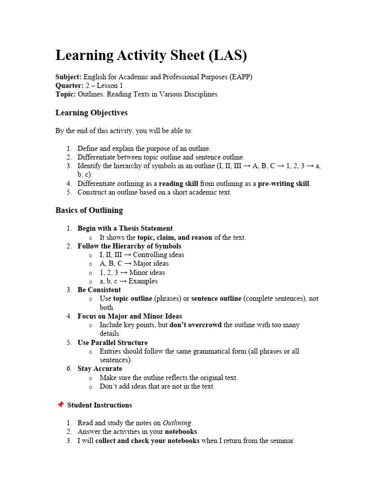 4. Differentiate outlining as a reading skill from outlining as a pre-writing skill.