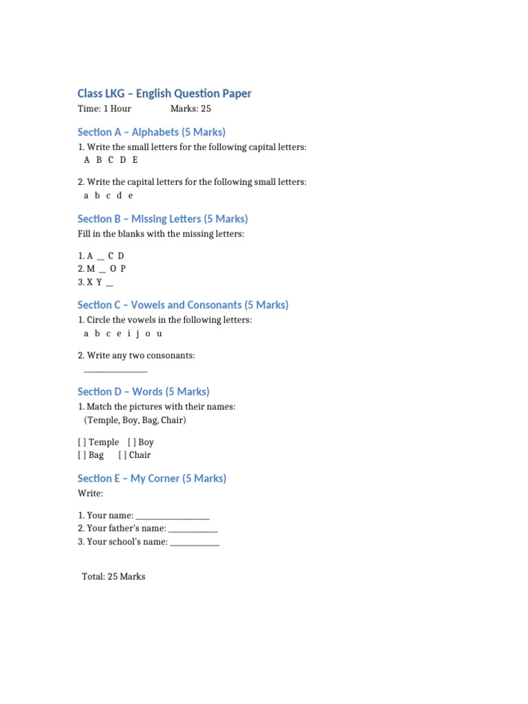 Class LKG – English Question Paper