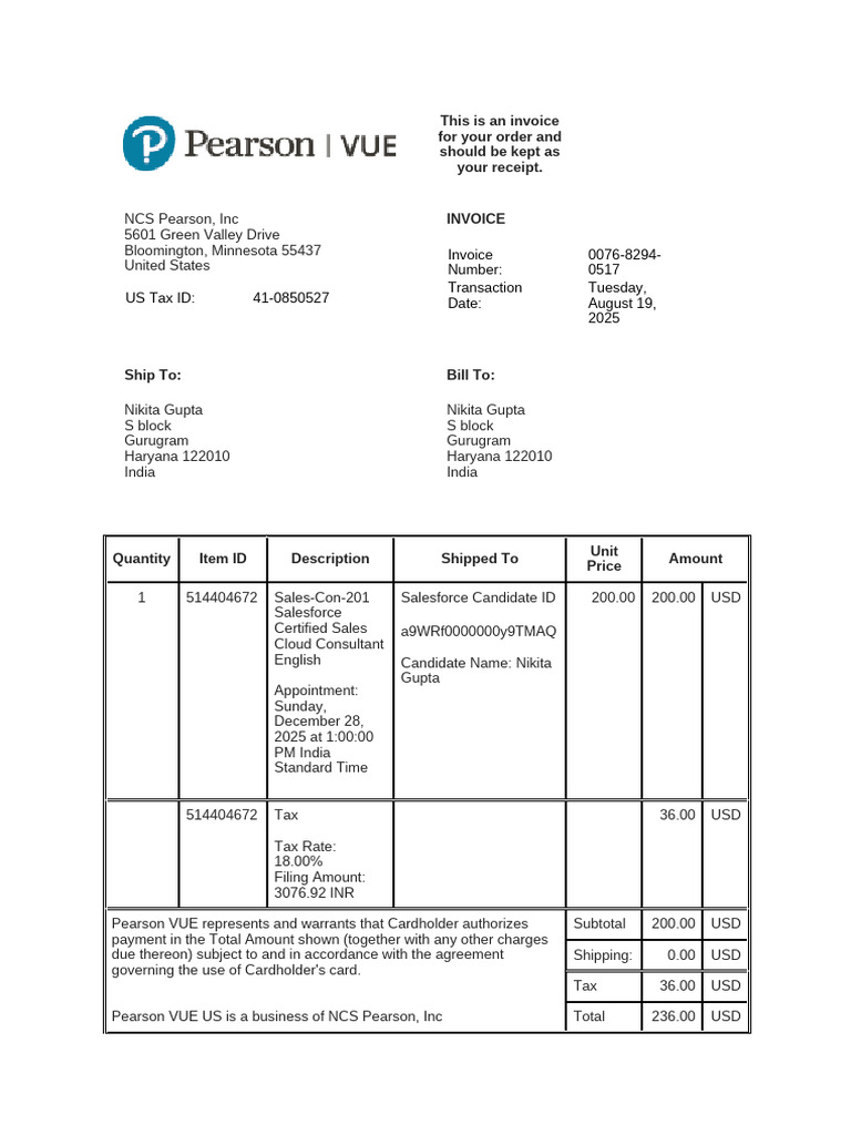 Pearson VUE US is a business of NCS Pearson, Inc Total 236.00 USD