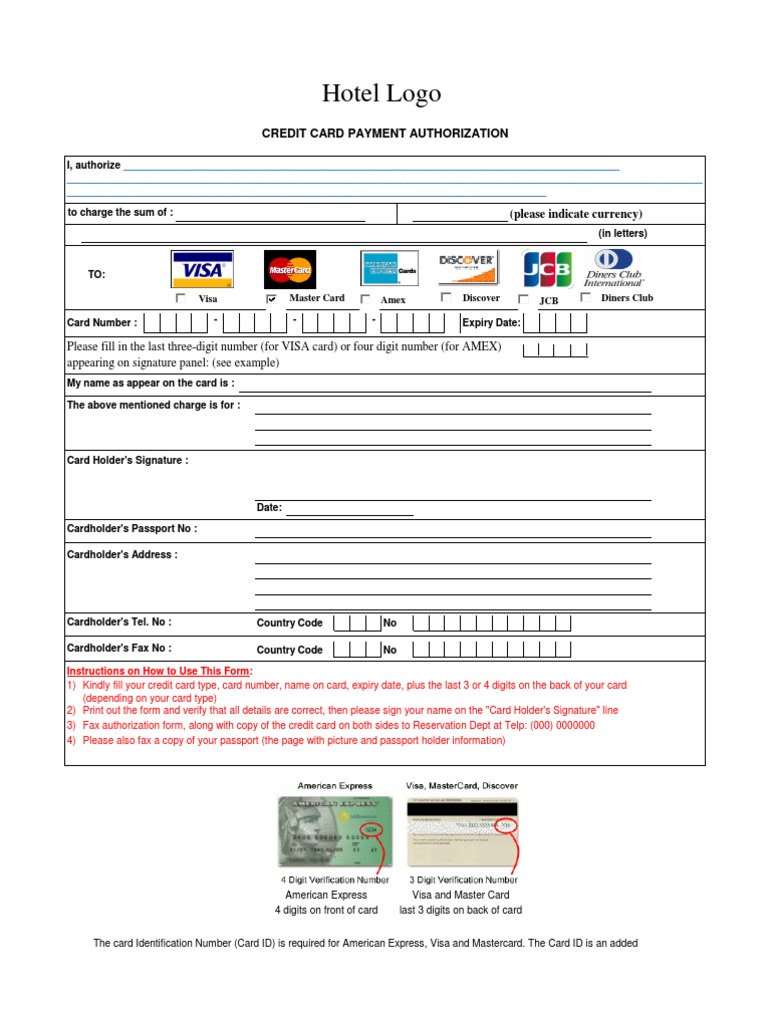 Instructions on How to Use This Form: 1) Kindly fill your credit card type, card number, name on card, expiry date, plus the last 3 or 4 digits on the back of your card (depending on your card type) 2) Print out the form and verify that all details are correct, then please sign your name on the "Card Holder's Signature" line 3) Fax authorization form, along with copy of the credit card on both sides to Reservation Dept at Telp: (000) 0000000 4) Please also fax a copy of your passport (the page with picture and passport holder information)