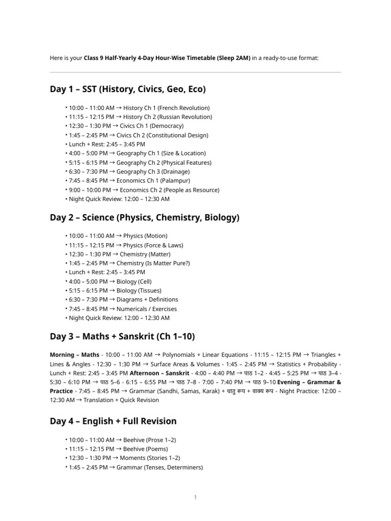Here is your Class 9 Half-Yearly 4-Day Hour-Wise Timetable (Sleep 2AM) in a ready-to-use format: