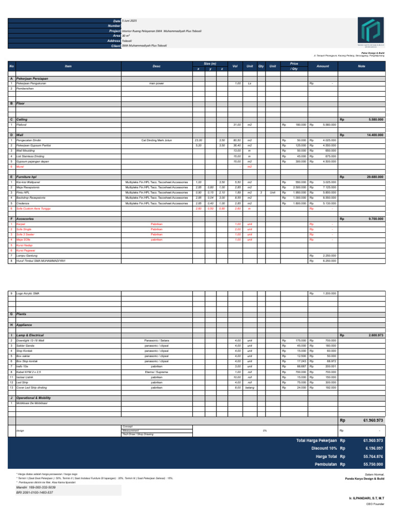 * Termin I (Saat Deal Pekerjaan ): 50%, Termin II ( Saat Instalasi Funiture DI lapangan) : 35%, Termin Iil ( Saat Pekerjaan Selesai) : 15%, Panda Karya Design & Build