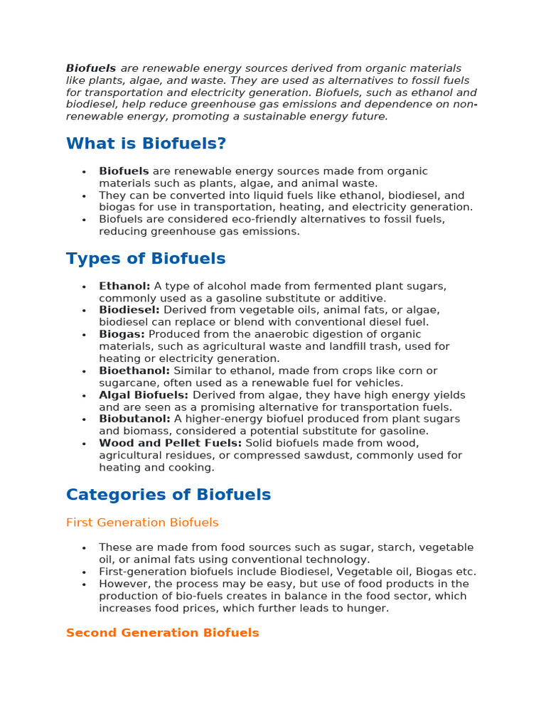 for transportation and electricity generation. Biofuels, such as ethanol and