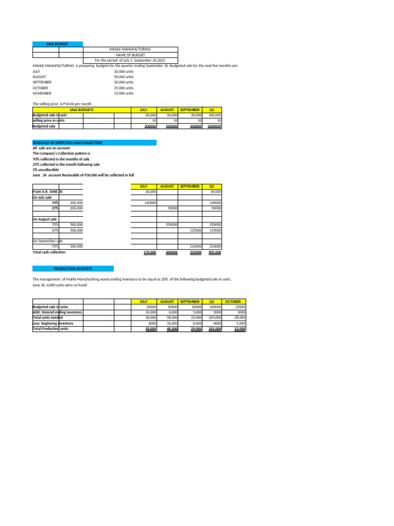 MAHLE MANUFACTURING is preparing budgets for the quarter ending September 30. Budgeted sale for the next five months are: