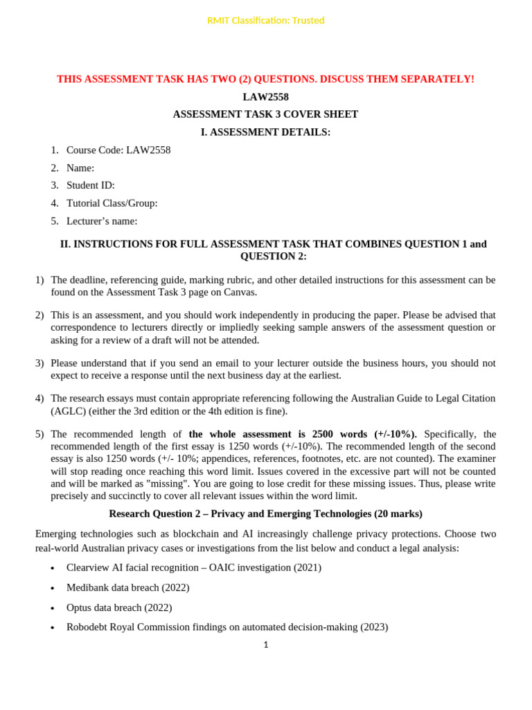 1) The deadline, referencing guide, marking rubric, and other detailed instructions for this assessment can be