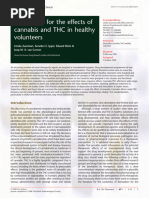 General Physical Effects on the Body Most of the effects of cannabis are caused by the chemical compound THC. It produces reversible tachycardia with the increase of cardiac labor and the demand of oxygen, and also the increase of blood pressure with the decrease in parasympathetic (deals with the nervous system) tone (S.C. Clark). For those who are chronic users, THC can lead to bradycardia, which is the slowness of the heart rate, usually fewer than 60 beats per minute (R.T. Jones). At higher dosage, dilation of the blood vessels can increase, causing dizziness and reddening. Other effects that THC offers are the effect on salivary glands and pupils and muscles. For the salivary glands, hypo salivation and dry mouth can happen. For the pupils, the reaction to light is slowed and tear flow is also decreased. With both of these effects in the mouth and eyes, there can be a potential increase in risk for infections in eye and respiratory tract. As for muscles, they are in a relaxed state, which causes the reduction in strength and impaired coordination. This could lead into possible falls or stumbling while walking. Tolerance The human body can develop tolerance to the effect of cannabis. In a study, Jones and Benowitz administer daily doses of 210 mg of oral dronabinol (synthesized THC) to 120 volunteers for 11-20 days. The volunteers did indeed develop a tolerance to the impairments and the psychological high by the end of the study. But then again, this was a controlled dosage of THC. The effects are related to the psyche of the body, so if the dosage was larger than what the body can handle, the user will show signs of symptoms. With tolerance, the effects of cannabis are dose-dependent.