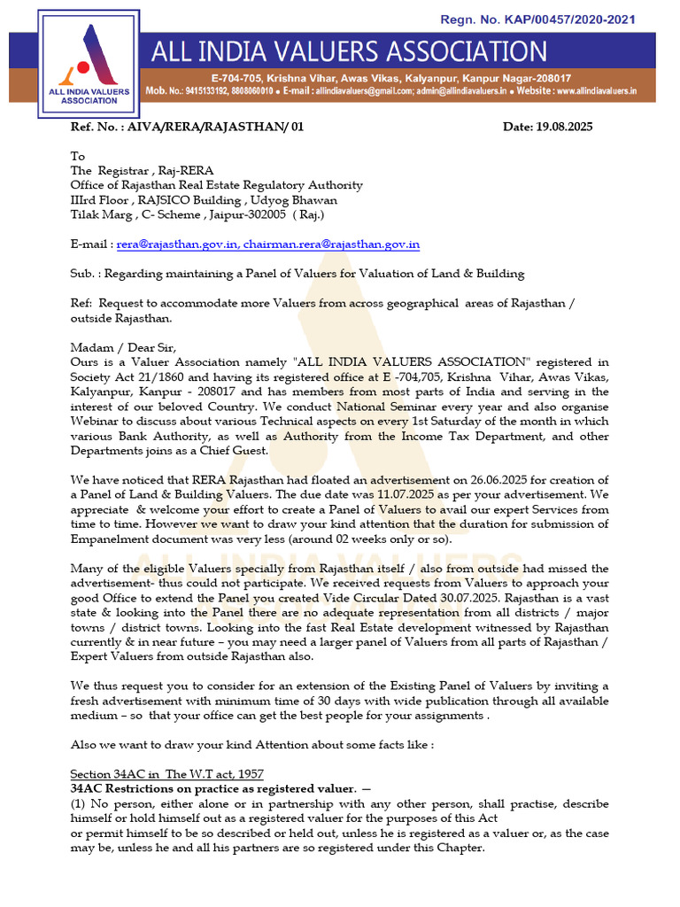Ref: Request to accommodate more Valuers from across geographical areas of Rajasthan /