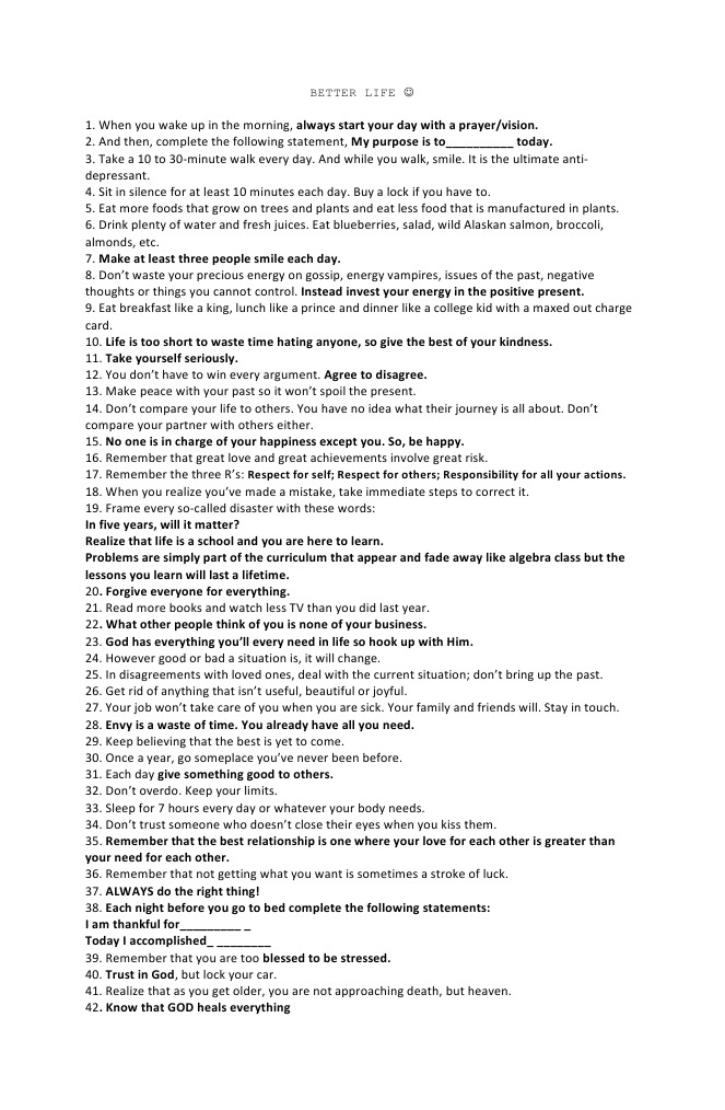 1. When you wake up in the morning, always start your day with a prayer/vision. 2. And then, complete the following statement, My purpose is to__________ today. 3. Take a 10 to 30-minute walk every day. And while you walk, smile. It is the ultimate antidepressant. 4. Sit in silence for at least 10 minutes each day. Buy a lock if you have to. 5. Eat more foods that grow on trees and plants and eat less food that is manufactured in plants. 6. Drink plenty of water and fresh juices. Eat blueberries, salad, wild Alaskan salmon, broccoli, almonds, etc. 7. Make at least three people smile each day. 8. Dont waste your precious energy on gossip, energy vampires, issues of the past, negative thoughts or things you cannot control. Instead invest your energy in the positive present. 9. Eat breakfast like a king, lunch like a prince and dinner like a college kid with a maxed out charge card. 10. Life is too short to waste time hating anyone, so give the best of your kindness. 11. Take yourself seriously. 12. You dont have to win every argument. Agree to disagree. 13. Make peace with your past so it wont spoil the present. 14. Dont compare your life to others. You have no idea what their journey is all about. Dont compare your partner with others either. 15. No one is in charge of your happiness except you. So, be happy. 16. Remember that great love and great achievements involve great risk. 17. Remember the three Rs: Respect for self; Respect for others; Responsibility for all your actions. 18. When you realize youve made a mistake, take immediate steps to correct it. 19. Frame every so-called disaster with these words: In five years, will it matter? Realize that life is a school and you are here to learn. Problems are simply part of the curriculum that appear and fade away like algebra class but the lessons you learn will last a lifetime. 20. Forgive everyone for everything. 21. Read more books and watch less TV than you did last year. 22. What other people think of you is none of your business. 23. God has everything youll every need in life so hook up with Him. 24. However good or bad a situation is, it will change. 25. In disagreements with loved ones, deal with the current situation; dont bring up the past. 26. Get rid of anything that isnt useful, beautiful or joyful. 27. Your job wont take care of you when you are sick. Your family and friends will. Stay in touch. 28. Envy is a waste of time. You already have all you need. 29. Keep believing that the best is yet to come. 30. Once a year, go someplace youve never been before. 31. Each day give something good to others. 32. Dont overdo. Keep your limits. 33. Sleep for 7 hours every day or whatever your body needs. 34. Dont trust someone who doesnt close their eyes when you kiss them. 35. Remember that the best relationship is one where your love for each other is greater than your need for each other. 36. Remember that not getting what you want is sometimes a stroke of luck. 37. ALWAYS do the right thing! 38. Each night before you go to bed complete the following statements: I am thankful for_________ _ Today I accomplished_ ________ 39. Remember that you are too blessed to be stressed. 40. Trust in God, but lock your car. 41. Realize that as you get older, you are not approaching death, but heaven. 42. Know that GOD heals everything