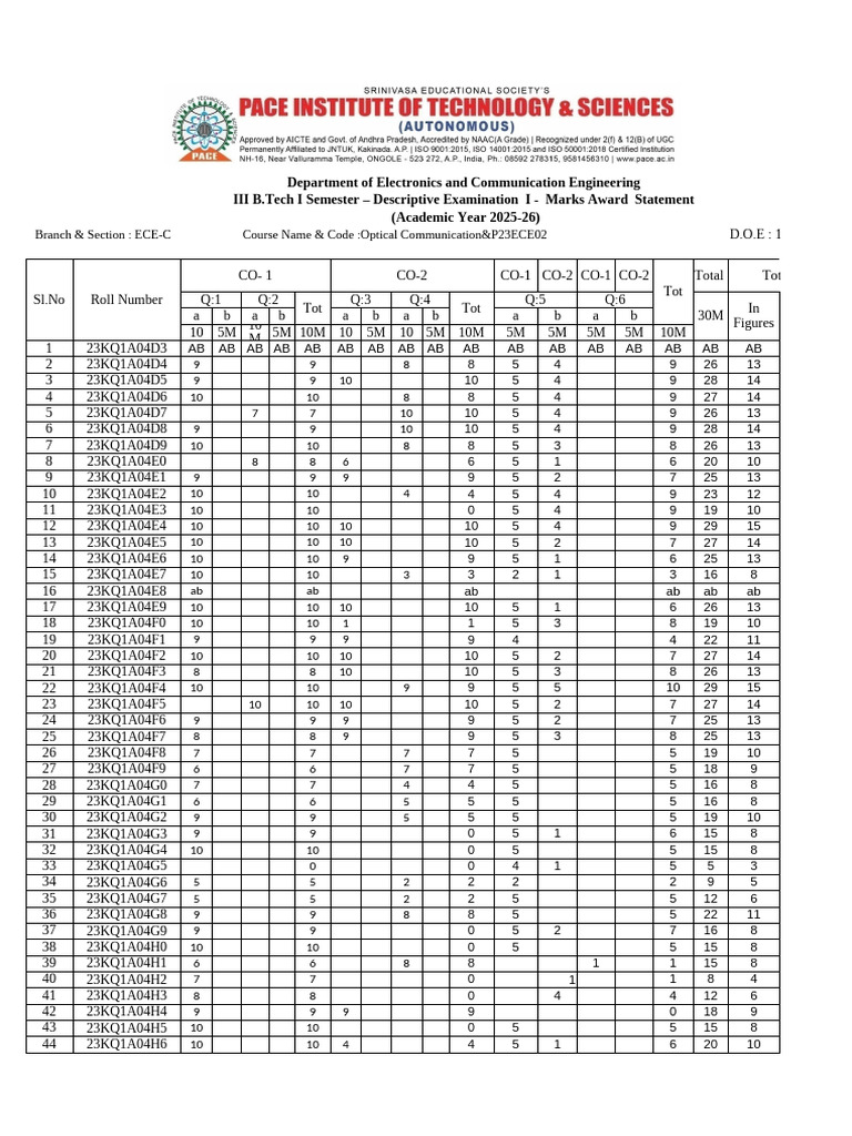 III [Link] I Semester – Mid II - Continuous Internal Evaluation Statement