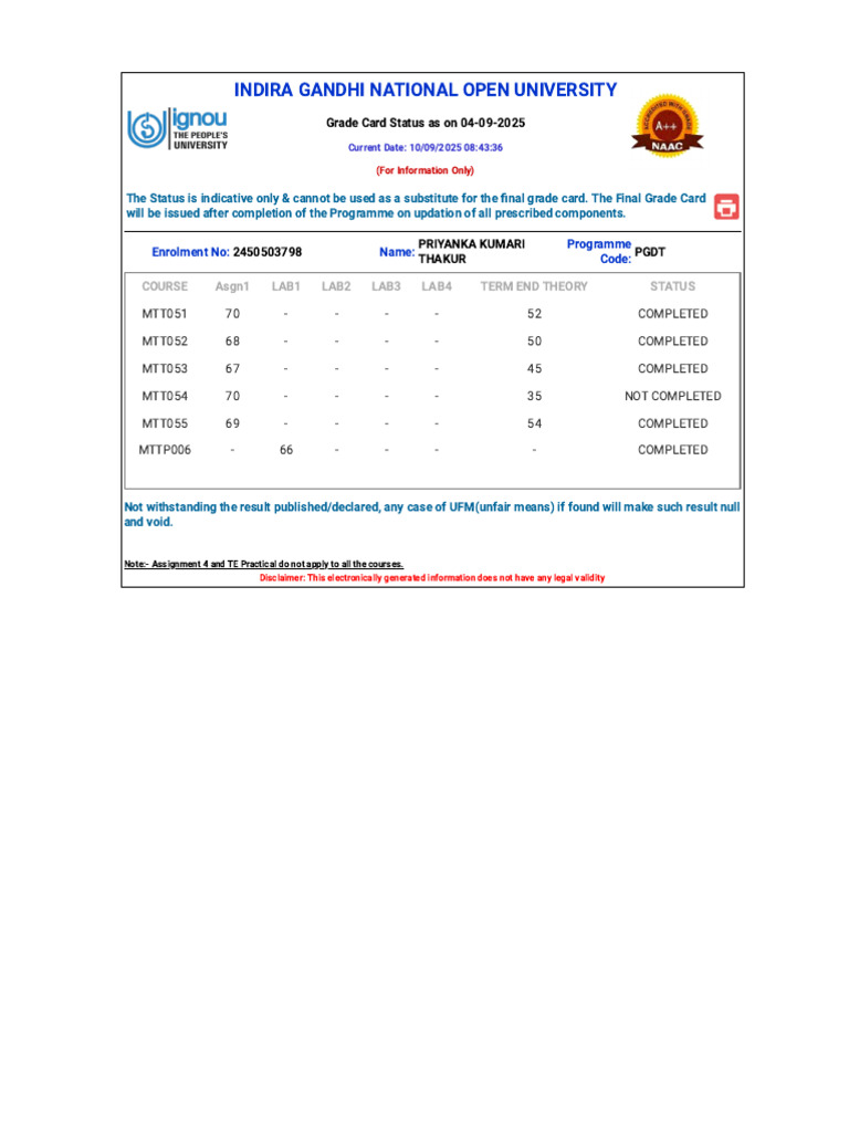The Status is indicative only & cannot be used as a substitute for the final grade card. The Final Grade Card