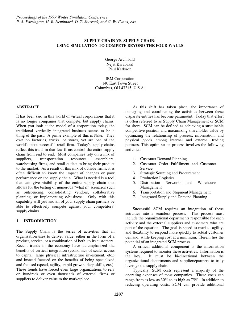 Archibald, Karabakal, and Karlsson AUTHOR BIOGRAPHIES GEORGE ARCHIBALD is a Consulting Sales Specialist on the IBM Global Supply Chain Management team. His current area of focus is in the application of simulation tools to improve the performance clients supply chains. He has a masters degree in Industrial and Systems Engineering from Ohio University. NEJAT KARABAKAL is consultant with IBM's Supply Chain Services. His focus is on supply chain simulation and optimization. For the last four years, he has been involved in several supply chain and manufacturing simulation and optimization projects. Major supply chain projects included a reengineering effort to improve the vehicle distribution system of a major automobile manufacturer, where combined optimization and simulation models were used to analyze the company's supply chain operations. Prior to his consulting career, he taught courses at the University of Michigan and Bilkent University in Turkey, including Simulation, Production and Inventory Control, and Operations Management. He received his Ph.D. degree in Industrial and Operations Engineering from the University of Michigan, with concentration in operations research . His M.S. and B.S. degrees, both in Industrial Engineering, are from Middle East Technical University in Turkey. PAUL KARLSSON is a Supply Chain Consultant for IBM Supply Chain Services. Currently, he primarily works with the IBM Supply Chain Analyzer to develop models for IBMs external clients to quantify the projected impacts of supply chain initiatives. He earned his MBA from The College of William and Mary and BBA from University of Mississippi.