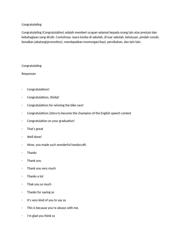 Congratulating (Congratulation) adalah memberi ucapan selamat kepada orang lain atas prestasi dan
