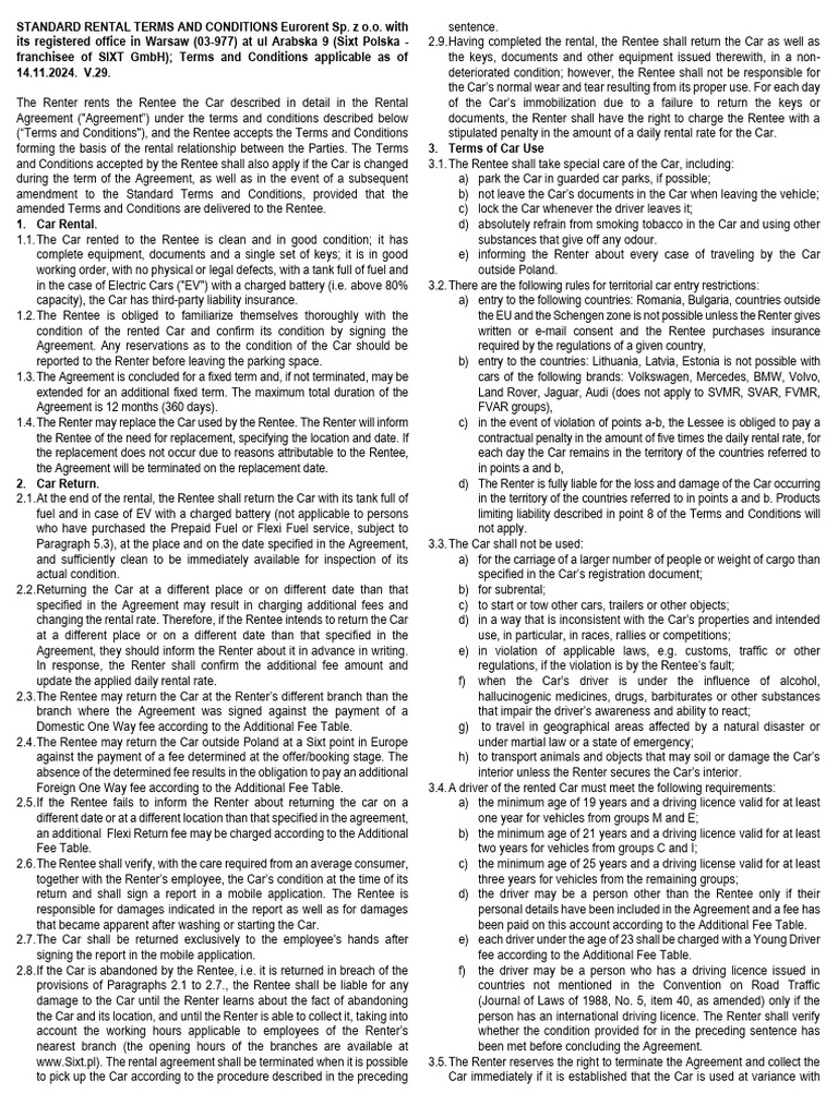 Car and make payments and secure the return of the Car and recovery of customerservice@sixt.pl The Rentee shall provide the agreement