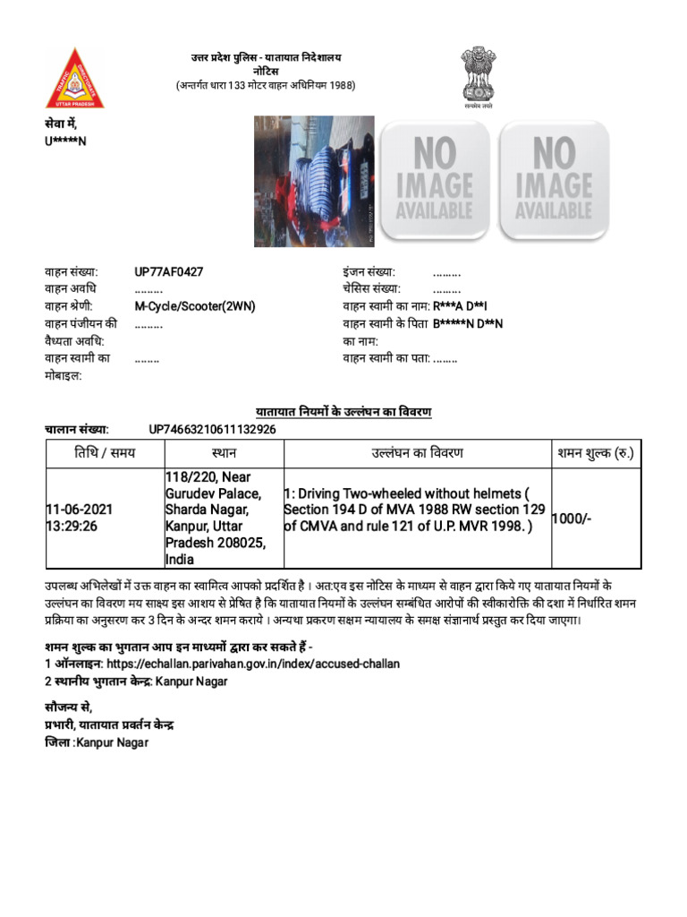 उपलब्ध अभिलेखों में उक्त वाहन का स्वामित्व आपको प्रदर्शित है । अत:एव इस नोटिस के माध्यम से वाहन द्वारा किये गए यातायात नियमों के