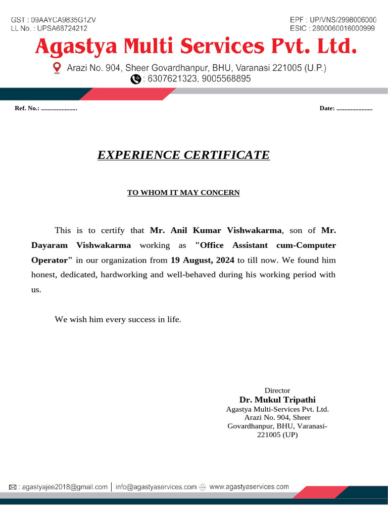This is to certify that Mr. Anil Kumar Vishwakarma, son of Mr.