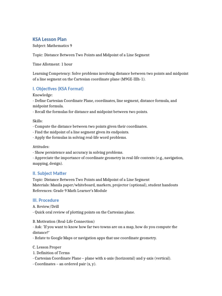 Learning Competency: Solve problems involving distance between two points and midpoint
