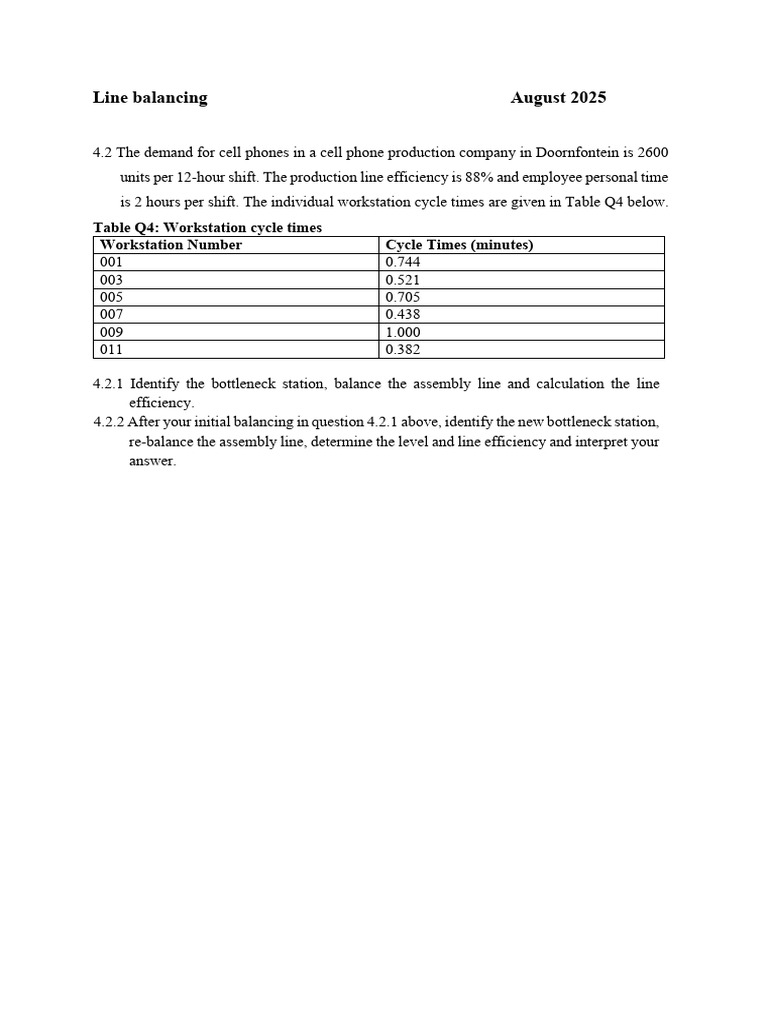 is 2 hours per shift. The individual workstation cycle times are given in Table Q4 below.
