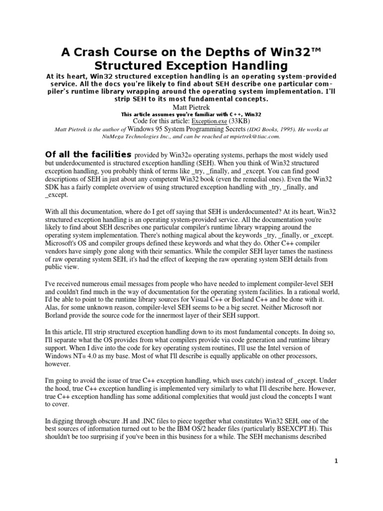 but underdocumented is structured exception handling (SEH). When you think of Win32 structured exception handling, you probably think of terms like _try, _finally, and _except. You can find good descriptions of SEH in just about any competent Win32 book (even the remedial ones). Even the Win32 SDK has a fairly complete overview of using structured exception handling with _try, _finally, and _except. With all this documentation, where do I get off saying that SEH is underdocumented? At its heart, Win32 structured exception handling is an operating system-provided service. All the documentation you're likely to find about SEH describes one particular compiler's runtime library wrapping around the operating system implementation. There's nothing magical about the keywords _try, _finally, or _except. Microsoft's OS and compiler groups defined these keywords and what they do. Other C++ compiler vendors have simply gone along with their semantics. While the compiler SEH layer tames the nastiness of raw operating system SEH, it's had the effect of keeping the raw operating system SEH details from public view. I've received numerous email messages from people who have needed to implement compiler-level SEH and couldn't find much in the way of documentation for the operating system facilities. In a rational world, I'd be able to point to the runtime library sources for Visual C++ or Borland C++ and be done with it. Alas, for some unknown reason, compiler-level SEH seems to be a big secret. Neither Microsoft nor Borland provide the source code for the innermost layer of their SEH support. In this article, I'll strip structured exception handling down to its most fundamental concepts. In doing so, I'll separate what the OS provides from what compilers provide via code generation and runtime library support. When I dive into the code for key operating system routines, I'll use the Intel version of Windows NT 4.0 as my base. Most of what I'll describe is equally applicable on other processors, however. I'm going to avoid the issue of true C++ exception handling, which uses catch() instead of _except. Under the hood, true C++ exception handling is implemented very similarly to what I'll describe here. However, true C++ exception handling has some additional complexities that would just cloud the concepts I want to cover. In digging through obscure .H and .INC files to piece together what constitutes Win32 SEH, one of the best sources of information turned out to be the IBM OS/2 header files (particularly BSEXCPT.H). This shouldn't be too surprising if you've been in this business for a while. The SEH mechanisms described 1