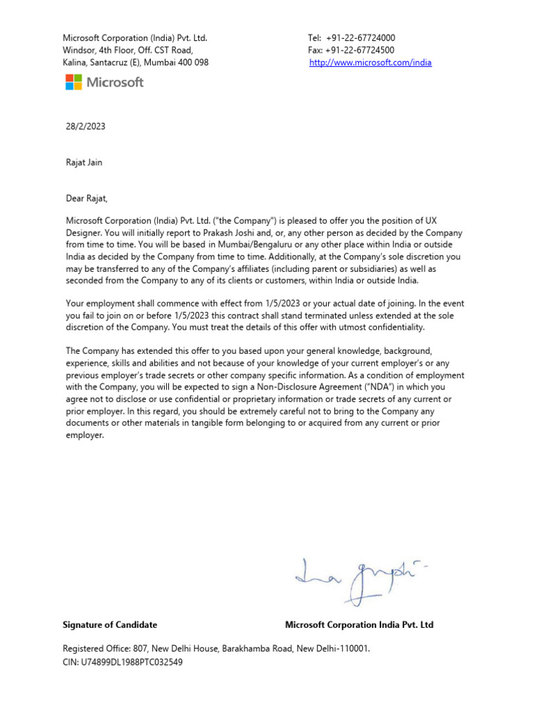 Microsoft Corporation (India) Pvt. Ltd. ("the Company") is pleased to offer you the position of UX