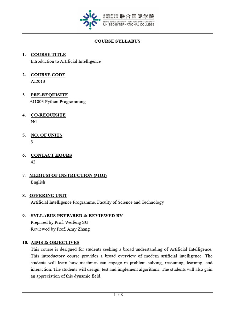 Course Code & Title: AI2013 Introduction to Artificial Intelligence