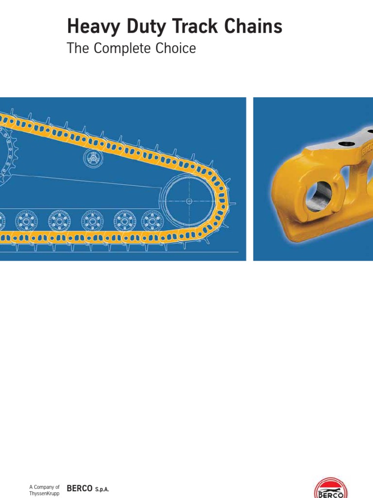 Berco Heavy Duty Track Chains Heavy duty, sealed & lubricated track chains have been specifically designed for increased pin & bushing retention. Track link incorporates greater pin-to-link and bushing-to-link contact areas while additional link wear material increases component life. Heavy Duty chains are also available in the version with Extreme Wear Resistance Bushings for maximum life in high abrasion environment. Exclusive heat treatment gives Berco links consistent surface hardness, superior hardened depth and strong core hardness. Berco pins & bushings are dimensionally matched to the links and manufactured to provide excellent track joint reliability, while the design ensures maximum sealability. All this results in excellent wear resistance, strength and durability for superior sealability and longer life. Heavy duty track chains work best in moderate to high impact conditions and they are ideal for rocky conditions, logging, reforestation, side sloping and for uneven terrain. Heavy duty track chains with Extreme Wear Resistance Bushings, work best in high abrasion/low impact applications. Your Best Undercarriage Value Greater pin-to-link and bushing-to-link contact areas for increased pin retention Higher track link provide additional wear material Track links are forged from deep hardening low alloyed boron steels with certified hardenability based on Bercos specification Links are quenched & tempered for tough and strong core hardness, superior strength and higher pin & bushing retention Rail surface induction hardened (HRC 53) to the wear limit (HRC > 45) Final furnace tempering reduces link chipping and spalling Bushings are treated in a special furnace for high temperature carburizing Pins are deep hardened for best resistance to wear and fatigue The choice of the leading OEMs The Complete Choice Heavy Duty Chains version with Extreme Wear Resistance Bushings available as an option For track-type machines ranging in class from D4H-HD to D7H-HD Suitable for XR, XL, LGP and TSK undercarriages Ultra low temperature (-50C) version available The choice of the leading OEMs Customer Satisfaction Considering that more than 50% of your maintenance costs will go into maintaining the undercarriage, it is not surprising that Berco represents the best choice when the time comes for the replacement. And the best choice is confirmed by the large number of Satisfied Customers that Keep Choosing Berco